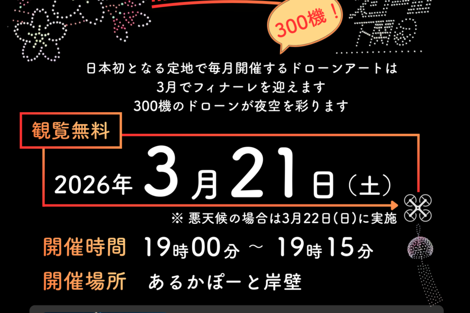 300機ドローンアートを開催します!by drone-shimonoseki日本初となる、定地で毎月開催するドローンアートが、 3月でフィナーレを迎えます!… 続きを読む »300機ドローンアートを開催します!