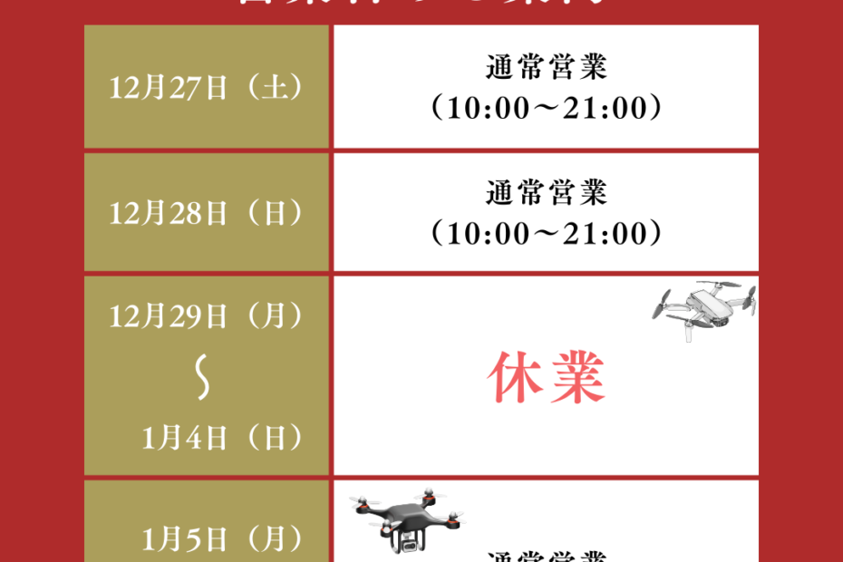 ドローンスクール下関の年末年始の営業についてお知らせします! 12月27日(土)…